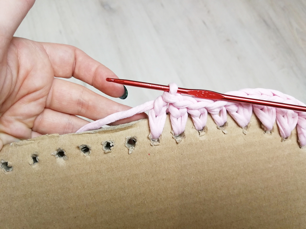 Bedenken Sie dabei dass Sie jede Reihe die folgt etwas größer machen. Häkeln Sie dabei am Rundenbeginn jeweils 2 Übergangs-Luftmaschen vor dem 1. Anschlag Häkel eine Luftmaschenkette mit 55 Maschen ganz wichtig schön fest häkeln.